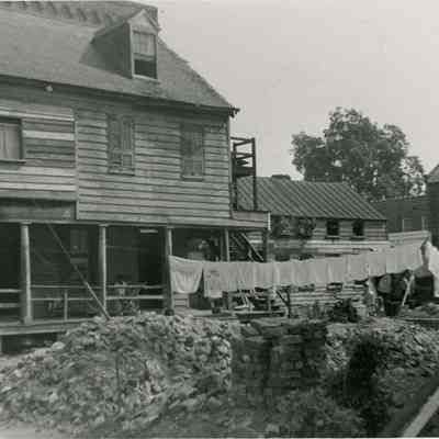 a-b: Street (front) elevation, corner view. People "hanging out" on the first floor piazza, where laundry is hung. Edge of 36 Archdale before its demolition is at right. Small section of the south elevation of 40 Archdale is at left.