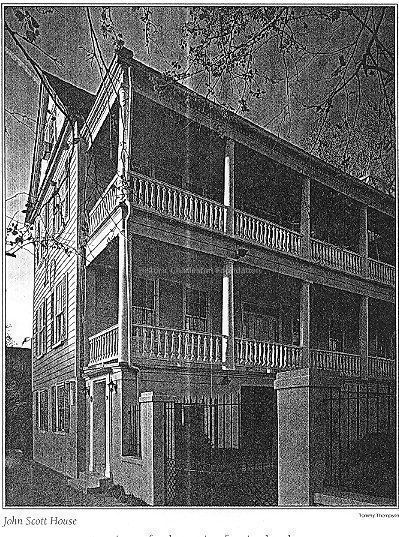 Bearing a striking resemblance to its nearby neighbor at 28 Coming Street, the house at 38 Coming Street was first built by John Scott in 1771 on a glebe land leased by Scott. Remodeled in the Greek Revival manner in the 1830s, its interior, nonetheless, retains some Georgian woodwork, and it still possesses its 18th century hipped dormers and beaded weatherboarding. It is one of five houses that became home in the 1970s to various sororities at the College of Charleston; also known as the John Scott House.