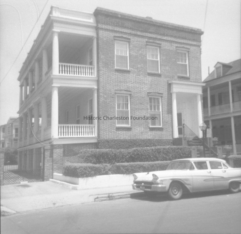 B&W photograph of 38 Hasell Street, corner view of house showing the south (front) and west (piazzas) elevations. Car parked on street in front of house.