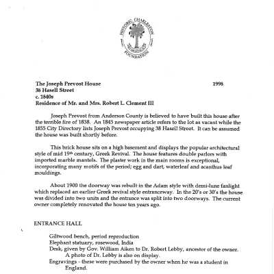 Historical/Miscellaneous File contains FOHG house history (1998); brief house history from Information for Guides of Historic Charleston (1984).