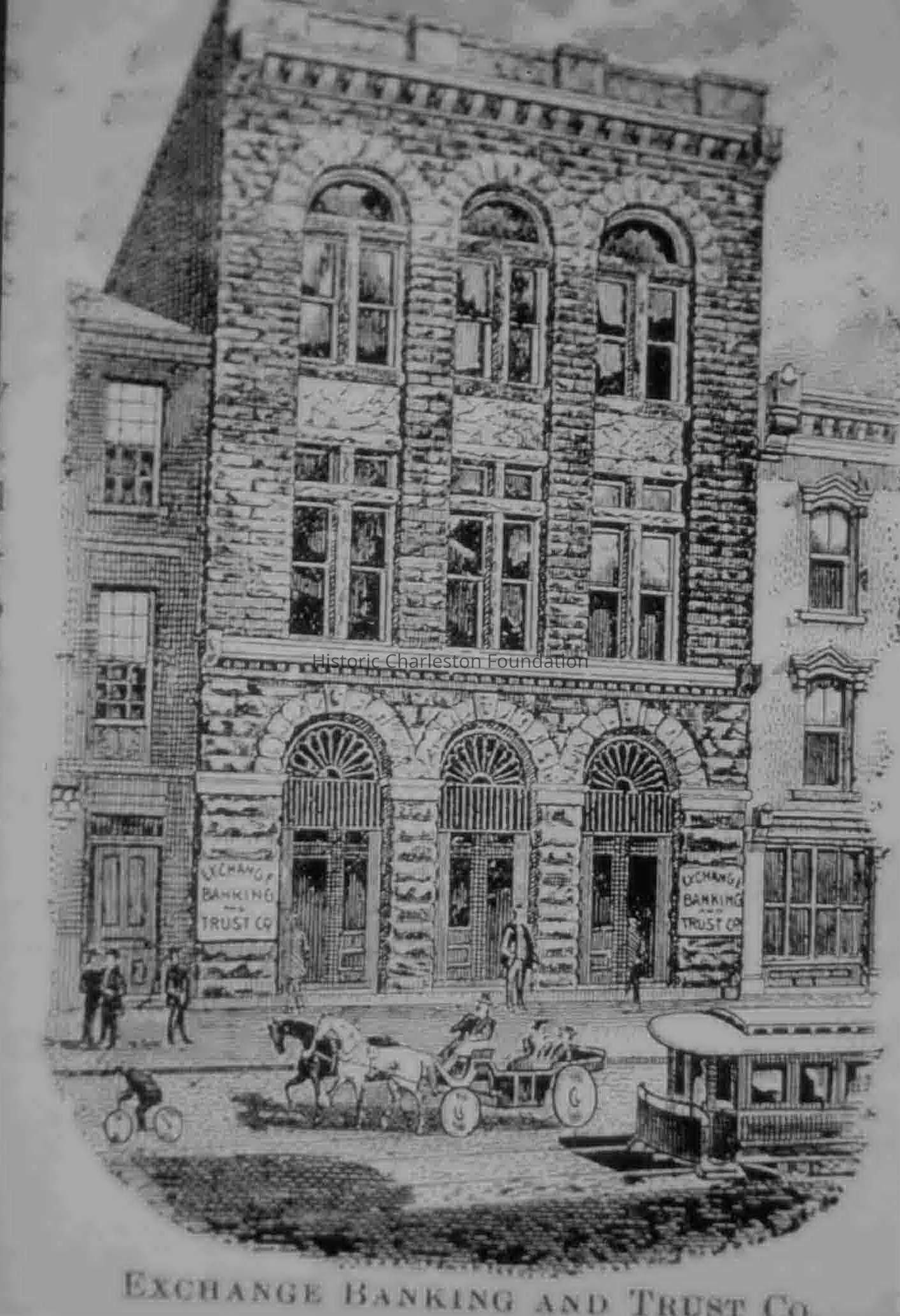 Photographic reprint of an engraving of the Exchange Banking and Trust Co. Building (39 Broad Street) from Harper's Weekly. Horse-drawn carriage, bicyclist, pedestrians, and a trolley car are on the street in front of the building. Sleeve contains 2 copies.Collection