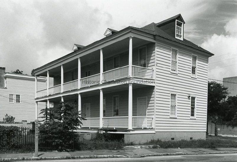 B&W photograph of 39 Laurens Street, corner view showing the east (East Bay Street) and south (piazzas) elevations.Collection