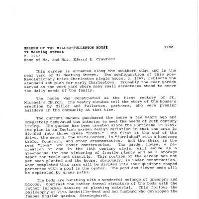 Constructed 1767; altered 1886-87. Miller & Fullerton, builders. One of the few known partnerships of housebuilders in colonial Charleston designed and executed this stuccoed brick single house for St. Michael's Church. It served as the parish's first minister's house but became a rental property after the Revolution and was eventually sold to rice planter William Read in 1825. Although retaining its notable compass-headed stair window on the north, the dwelling received considerable damage in the earthquake and now boasts a bracketed Victorian cornice. (Poston, Buildings of Charleston.)