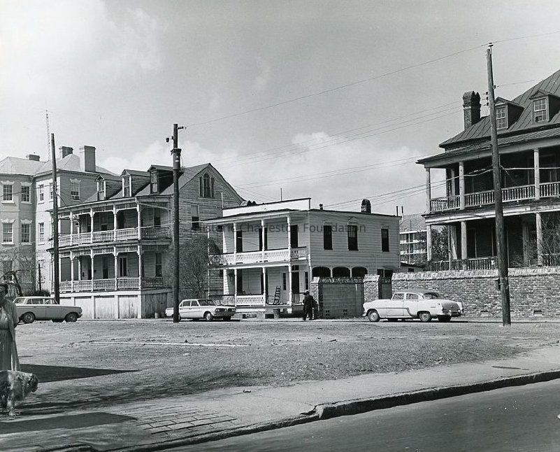B&W photograph of the view across a vacant lot at the southwest corner of George and Anson Street, showing (from left to right) 14 George Street, 8 George Street (before restoration), 6 George Street (later demolished), and 4 George Street. Cars parked on the street and on the lot. Two pedestrians on the sidewalk. Woman walking a dog in left foreground.Collection