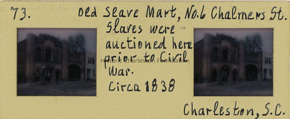 Color stereoscope slide* of 4-8 Chalmers Street, taken from across the street. Shows (L to R) the German Fire Insurance Society building (8 Chalmers), Old Slave Mart Museum (6 Chalmers), and 4 Chalmers.