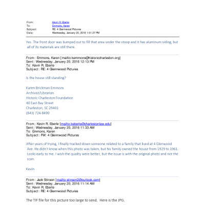 Provided by Kevin Eberle via email on 1/20/2016. Scan of photograph was went to him by Jack Stinson, a relative of the original owner, who owned the house from 1929-1961. Per Kevin: photo appears to be early.Created By