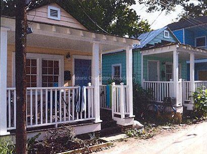 Constructed early 20th century. Identical but mirrored structures that occupy a single lot. Both houses are single-story, lifted brick column foundation, front-gabled shotgun style houses with narrow front porches that run the width of the facade. Side-oriented entrances.