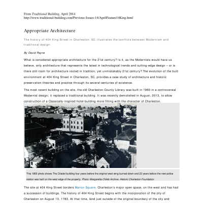 Notes: "Appropriate Architecture" also available at http://www.traditional-building.com/Previous-Issues-14/AprilFeature14King.html.