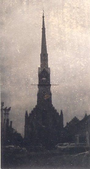 B&W photograph of St. Matthew's Lutheran Church (405 King Street), at night or dusk(?) showing silhouette of building. Taken from the parking lot that had been across the street.Collection