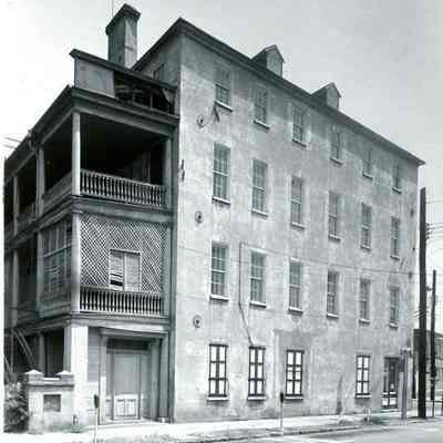 Three photographs of 409 King Street (Radcliffe-Aimar Building/Rev. Ferdinand Jacobs Seminary for Girls). At time of photo, signage for G.W. Aimar & Co. Druggists on building.