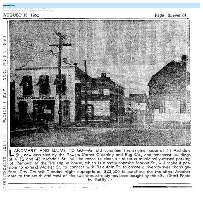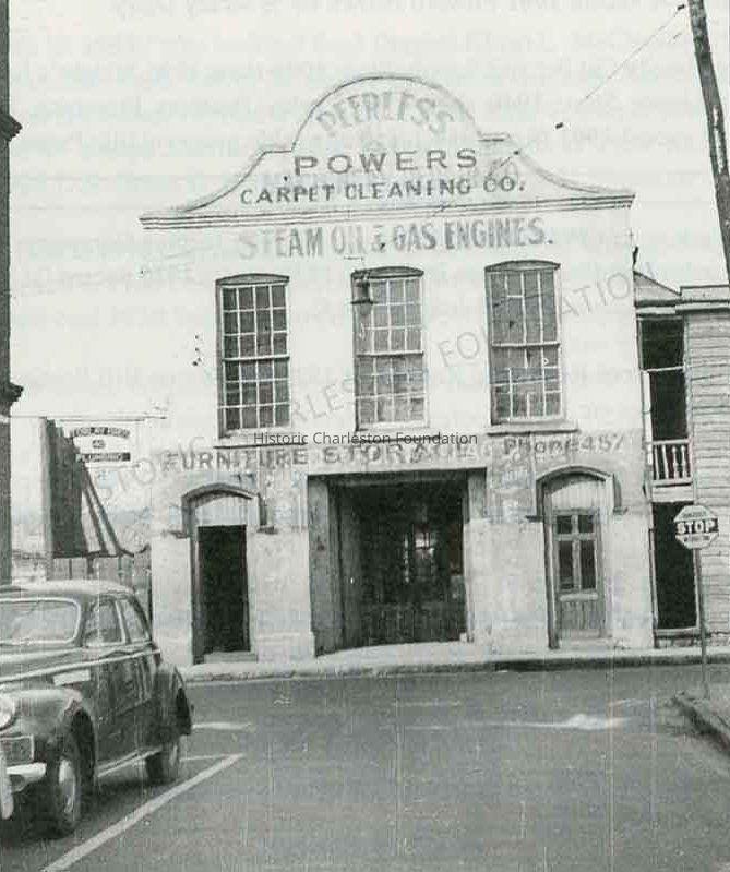 Scan of a published photograph of 41 Archdale Street viewed from Market Street looking north. The building once served as the "Old Fire Engine House" and the Powers Carpet Cleaning Company. It was demolished ca. 1951 for the construction of a parking lot. Market Street diddn't always cut through between Logan and Archdale, so this was one of the buildings demolished to alter the street layout. (News & Courier; This is Charleston; Old Codgers' Charleston Address Book).
