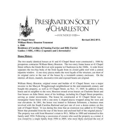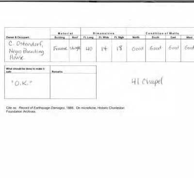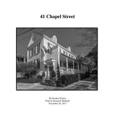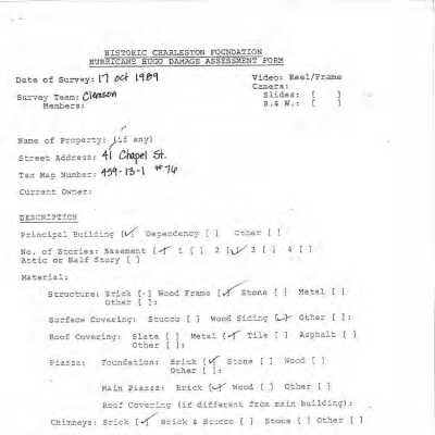 File contains graduate student report (Kendra Waters, 2017) on the history of the house/property, which includes historical and chain-of-title research, maps, photos, and other supporting documentation; FOHG house histories (2013, 2016); Preservation Society Tour house history (2012); 1886 Earthquake Damage Assessment (pdf); Hurricane Hugo Damage Survey (pdf).Collection