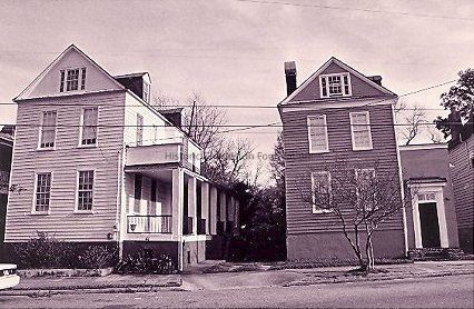 One of two nearly identical houses constructed ca. 1846 by prosperous contractor William Henry Houston. The house is a two-story frame house reflecting the Greek Revival style. A wide frieze separates the two-bay body of the front facade from its closed gable roof with a central tripartate window. A one-story piazza marks the west facade. (Source: Preservation Society house history.)