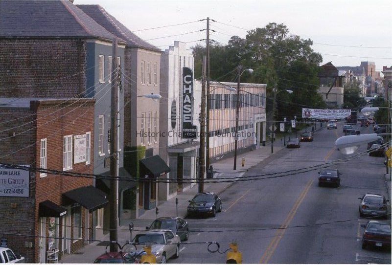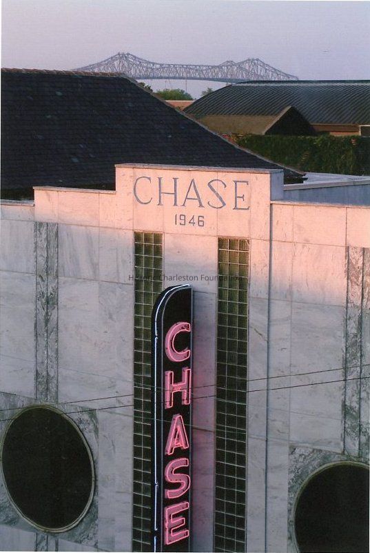 e: Upper level of the Chase Furniture Company west (front) facade showing the neon "CHASE" sign. The old Cooper River Bridges can be seen in the distance.