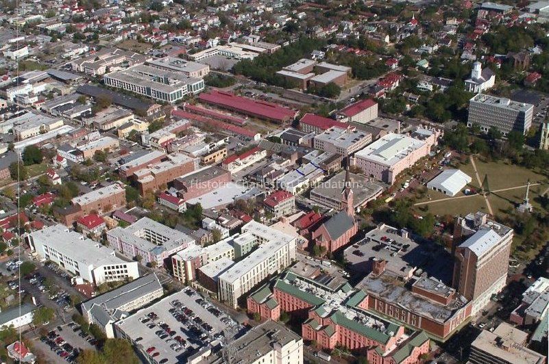 f: Aerial view looking northeast from the Francis Marion Hotel. Marion Square and at mid-right of photo.Collection