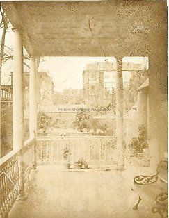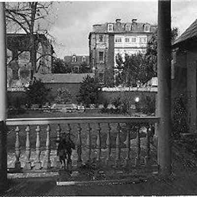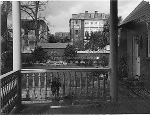d: View of backyard garden from piazza, showing more of the piazza floor than photo c. Faded, poor quality. Blake Middleton handwritten on back. Measures 3"x4".Collection
