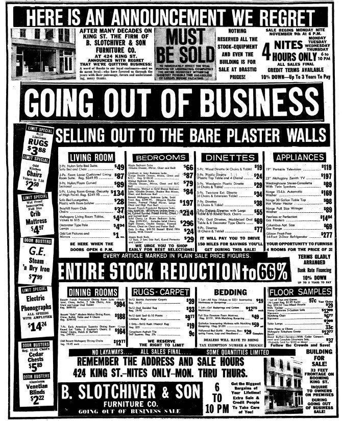 B&W photograph (scan) of 424 King Street (B. Slotchiver & Son Furniture Co. and Gene's Electric Service), street (front) elevation.Context