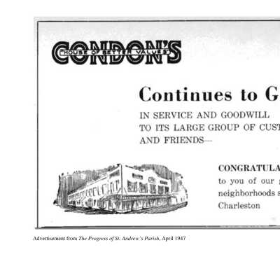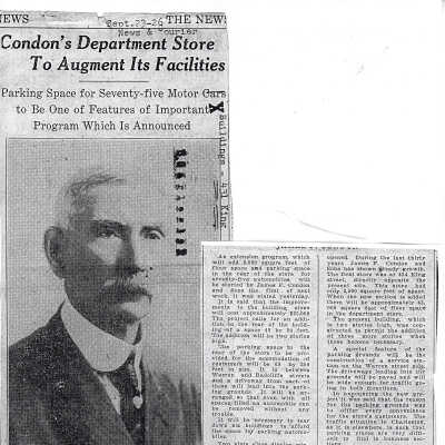 File contains newspaper articles (1926-1997) about Condon's Department Store and its use and changes over time; newspaper advertisement (1914); advertisement (1947).