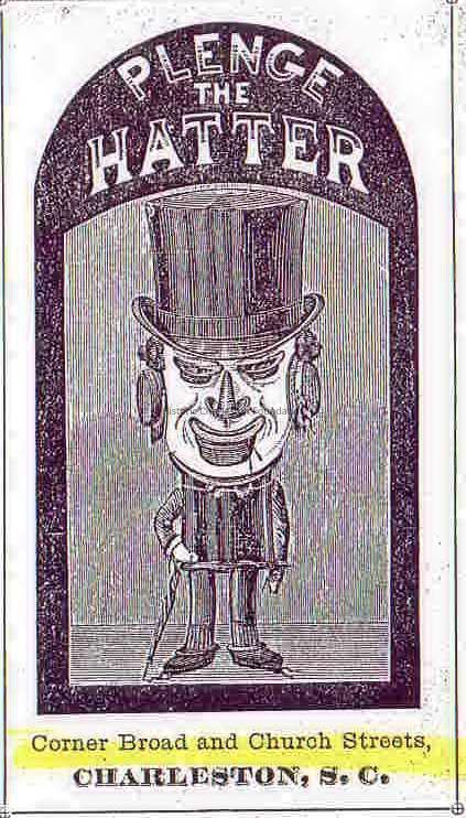 Constructed ca. 1855; renovated ca. 1870. Although built in the antebellum period as the shop of the saddler and harness makers Charles Love and Conrad M. Wienges, this large structure was thoroughly altered in about 1870 by its subsequent owner, haberdasher Charles Plenge, with the addition of a pressed tin cornice and Italianate facade treatments in stucco. One of the enduring characteristics of the building is the late-19th century painting, The Hatter, on the west facade that formerly served as signage and a popular trademark. William Waller, a saddler, built the structure next door at 41 Broad Street. A subsequent owner added a new facade to this building with an Italianate cornice and window head within a few years after the Civil War. (Poston, Buildings of Charleston.)
