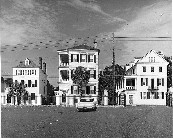 B&W photoraph of 43 East Bay, 45 East Bay, and 47 East Bay, viewed from the Missroon House parking lot across the street. Car parked in parking lot at center of photo.Collection