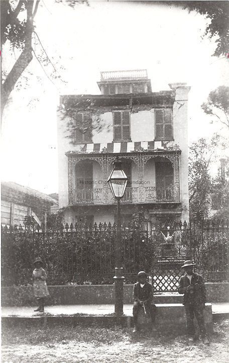 B&W photograph of 43 Bull Street, street elevation, presumably taken shortly after the 1886 Earthquake, showing roof damage. Three children on sidewalk in front of gate.Collection