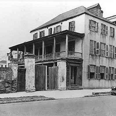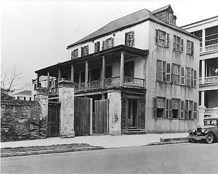 Constructed ca. 1755; restored 1935. This house lies very close, if not immediately adjacent, to the site of the original city wall and was constructed on a portion of Grand Modell Lot No. 1. Adam Daniel conveyed this lot, inherited from his father, to George Sommers with a "tenement" in 1755. Stylistically the house seems to date from the mid-18th century, particularly due to the profiles of the moldings in its 2nd-floor rooms and the paneling in its 1st-floor dining room. A surviving plat shows the layout of the single house and its extensive 2-story outbuildings to the rear of the lot; these structures still survive. Formerly this building, like many Charleston single houses, maintained an entrance on the street facade and a front ground-floor room for commercial purposes. In the early 19th century the door was closed and the piazzas added, as was the late Federal style piazza door screen. The bend in East Bay just beyond this lot led the area to be known in the 1700s as Sommers Corner. This very bend impelled the builder of the Sommers House to follow the diagonal of the street in the construction of the front facade. Passing through several prominent merchant families, including those of John Teasdale, a British officer who became the first Charleston factor to ship cotton to Europe, and John Fraser, founder of the important mercantile firm Fraser and Trenholm, the dwelling suffered from deterioration in the early-20th century. Elizabeth Hanahan, a pioneering realtor in Charleston, restored the house in 1935 as her family's residence, with the assistance of preservation architects Albert Simons and Samuel S. Lapham. (Poston, Buildings of Charleston.)