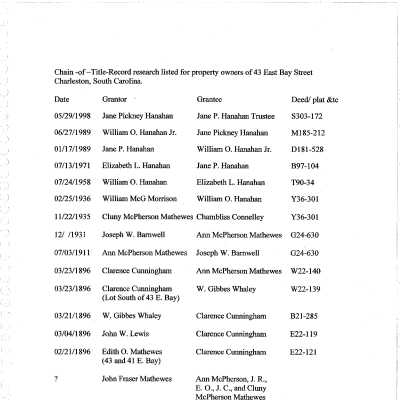 Files contain documentation of the easement on the property; property appraisal; FOHG house history (ca. 1982, 2003); house history from Information for Guides of Historic Charleston; house history from Vernacular Architecture of Charleston & the Lowcountry; occupancy history from Old Codgers' Charleston Address Book; architectural history on the kitchen/laundry/quarters by Edward Chappel (1997); photocopy of early 20th century photograph; plat (1796); historical/chain-of-title research notes; architectural drawing; graduate student report (Christopher Ohm, 2005) on the history of the building/property, including deeds, wills, plats, chain-of-title and maps; newspaper article (DYKYC); tour notes and research on the outbuildings and the enslaved persons in preparation for HCF's "Beyond the Big House Tour" (HCF, 2017).