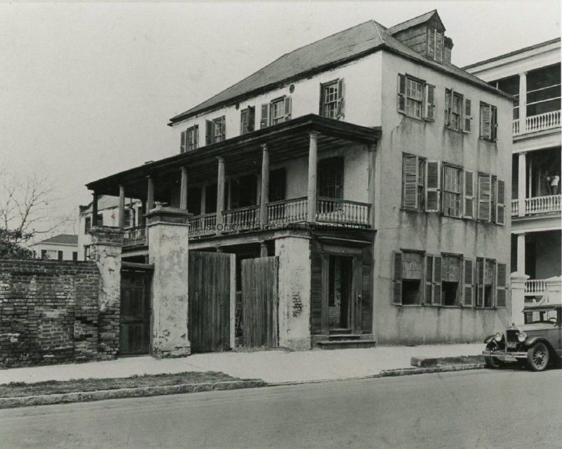 B&W photograph of 43 East Bay Street, corner view, southeast elevation. Early 20th century view of house before its 1935 restoration. Car parked in front.Collection