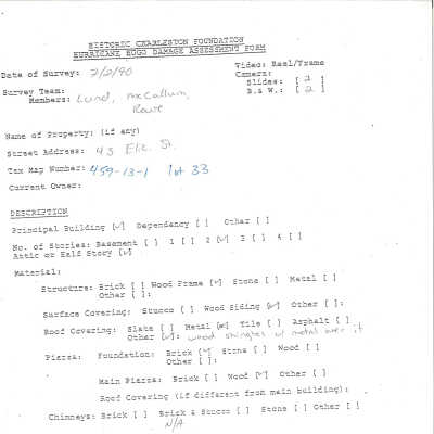 File contains graduate student report (Kerri Ross, 2017) on the history of the building/property, which includes historical and chain-of-title research, maps, photos, plats, and other supporting documentation; newspaper article about restoration (1992); Hurricane Hugo Damage Survey (PDF on Media link).Collection
