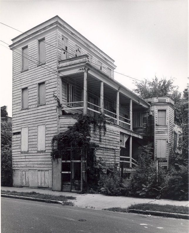 B&W photograph of 43 Laurens Street before restoration, corner view showing the north (front) and west (piazzas) elevation.Collection