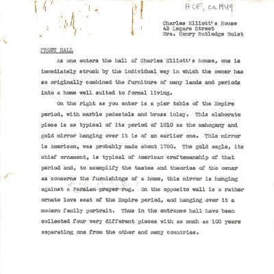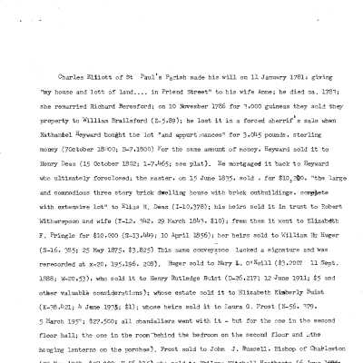 File contains FOHG house histories (ca. 1949, 1995, 1998, 2010); other narrative histories; newspaper articles (1937 DYKYC, 1984); historical/chain-of-title research notes including copy of 1802 plat; photocopy of 1911 title with plat (Mary C. O'Neill to Henry Rutledge Buist); photocopy of 1852 plat; excerpt about Charles Elliott from book (source not indicated).Collection
