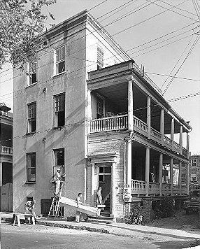 B&W photograph of 43 Society Street (Robert M. Venning House), street (front) elevation, corner view of building showing piazzas. Building is being worked on by four men, possibly air conditioning installation. Signage for Lennox Heating and Air Conditioning posted at entry.Collection