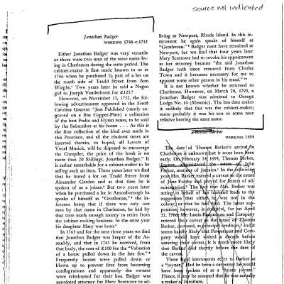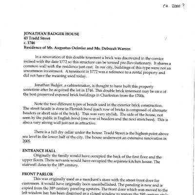 Three files contain documentation of the easement on the property including Deed of Conservation Easement (exterior); Confirmation of Understanding; easement donation acknowledgment letter; Part I certification (National Register); easement appraisal report; IRS form 8283; FOHG house histories (1995, 1997, ca. 2000); biographical information on Jonathan Badger (unattributed); photocopy of photographs of the door casing (unattributed, undated); history of the William Werner family (associated with 43 Tradd Street in the early 1800s) (Davis, 1995).