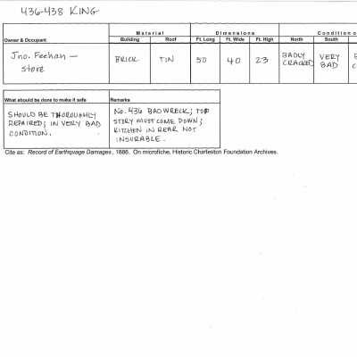 File contains graduate student report (Sarah Sanders, 2013) on the history of the building/property, which includes historical and chain-of-title research, maps, photos, and other supporting documentation; 20th c. occupancy history from Old Codgers' Charleston Address Book; 1886 Earthquake Damage Assessment.