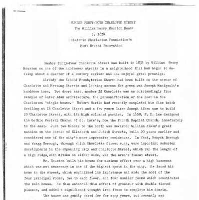 Constructed 1834; rehabilitated 1966-74. With its piazzas facing the street in the plantation style, like its neighbor at 40 Charlotte Street, William Henry Houston's raised, 2½-story house overlooks the western edge of Mazyckborough. Substantial Greek Revival door architraves and oversized dormers with tripartite windows differentiate the Houston House from its more traditional neighbors. In the antebellum period, Houston added a stucco coping with Gothic Revival style piers and a wrought-iron fence to protect his front property line. Beginning his career as a carpenter in the neighborhood of Middlesex to the south, Houston became a wealthy building contractor and by the 1830s owned properties throughout Charleston, including seven houses on Charlotte Street alone. The Houston family lived at this address until the 1880s when it was sold at auction to the secretary of the Northeastern Railroad. After decades of 20th century neglect and two fires, it was rehabilitated by Historic Charleston Foundation as one its Rehabilitation Projects. (Poston, Buildings of Charleston.)
