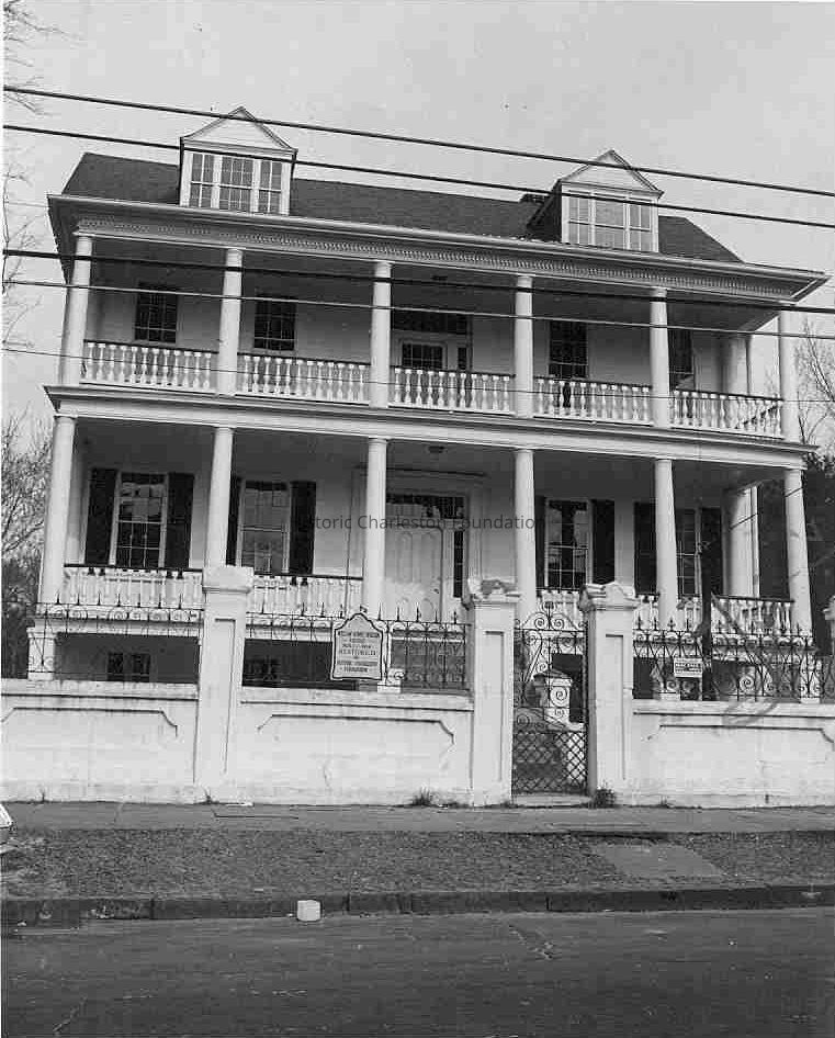 B&W photograph of 44 Charlotte Street (William Henry Houston House), street (front) elevation, after restoration by Historic Charleston Foundation. Sign on gate: "William Henry Houston House - Built c. 1834 - Restored by Historic Charleston Foundation."Collection