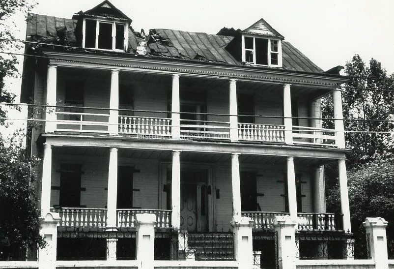 B&W photograph of 44 Charlotte Street (William Henry Houston House), street (front) elevation before restoration by Historic Charleston Foundation, showing the house in a deteriorated condition, especially the roof.Collection