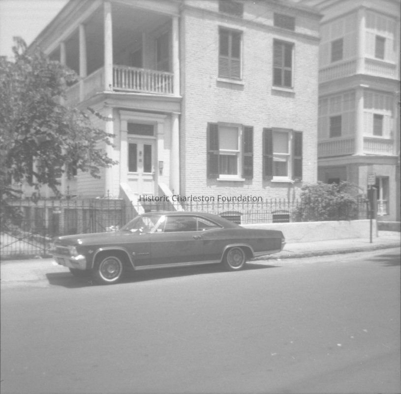 B&W photograph of 44 Hasell Street (James Stocker House), corner view of the house showing the south (front) and west (piazzas) elevations. Car parked on street in front of house.