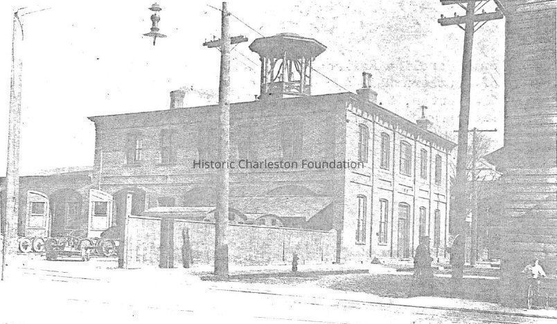 This two-story brick building with a long one-story rear extension was built ca. 1850 as the engine repair house of the South Carolina Railroad (a/k/a car shop). (Source: Information for Guides of Historic Charleston)