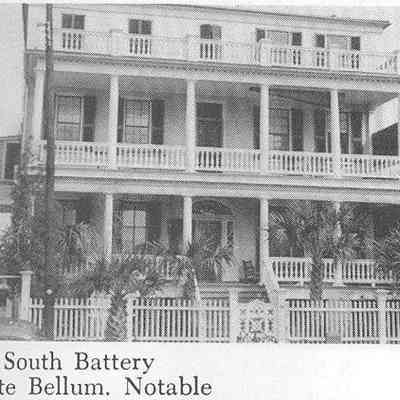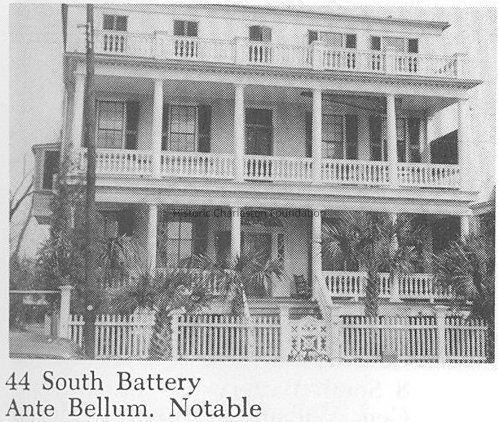Constructed ca. 1835. This 3-story plantation house was built about 1835 by spinster sisters Anne and Catherine Johnston on lots left by their grandfather, McKenzie. The residence was purchased by Gen. Benjamin Huger Rutledge after the Civil, and the art historian Anna Wells Rutledge lived much of her life there. The house and its contemporary neighbor at 46 South Battery retain their original substantial wood picket fences on masonry piers and carved lattice gates. Such fences and gates tended to be more common devices for enclosure of early Charleston lots and have progressively deteriorated and disappeared from most neighborhoods in the city. (Poston, Buildings of Charleston.)