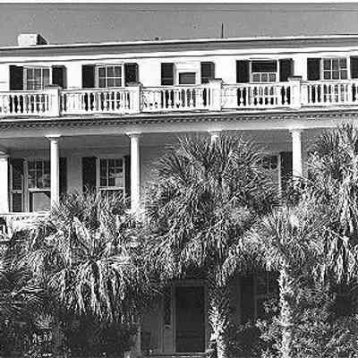 B&W photographs of 44 South Battery (Johnston House), street (front) elevation. House is partially obscured by palm trees.