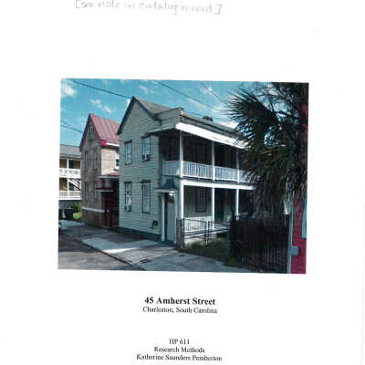 Built ca. 1860, this Charleston single house is situated in the northeastern portion of the lot, with the gable end facing Amherst Street. The piazza screen on the porch is right off of the sidewalk. It is double story with a parapet facing the street. The piazza runs parallel to the driveway on the west side of the property, but does not run the full western length of the building. The porch stops when it meets 45 Amherst's late 1800s two-story addition. A 1950s metal awning further articulates the two-story piazza. Above the door of the piazza screen is a bracketed hood and 2-light transom window. These, along with wooden pilasters are Gothic Revival in nature, probably added around the same time as the two-story addition in the rear of the house. Modem asphalt shingle roof and green painted flush board round out this simple residence.