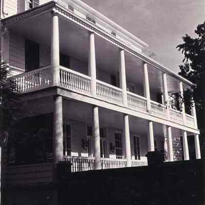 Two B&W photographs of the Thomas Wallace House (45 Laurens Street), corner view showing the north (front) and west (piazzas) elevations, different orientations.Collection