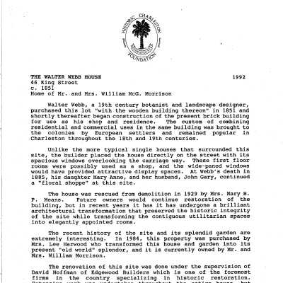Constructed ca. 1851. Walter Webb, a botanist, florist, and garden designer, purchased this lot "with a wooden building thereon" in 1851 and shortly thereafter began the construction of 46 King Street as his shop and residence. Unlike the earlier building at 44 King Street, which stood on its site by 1794, Webb built his dwelling with the long facade parallel to the street, a less typical site arrangement in Charleston