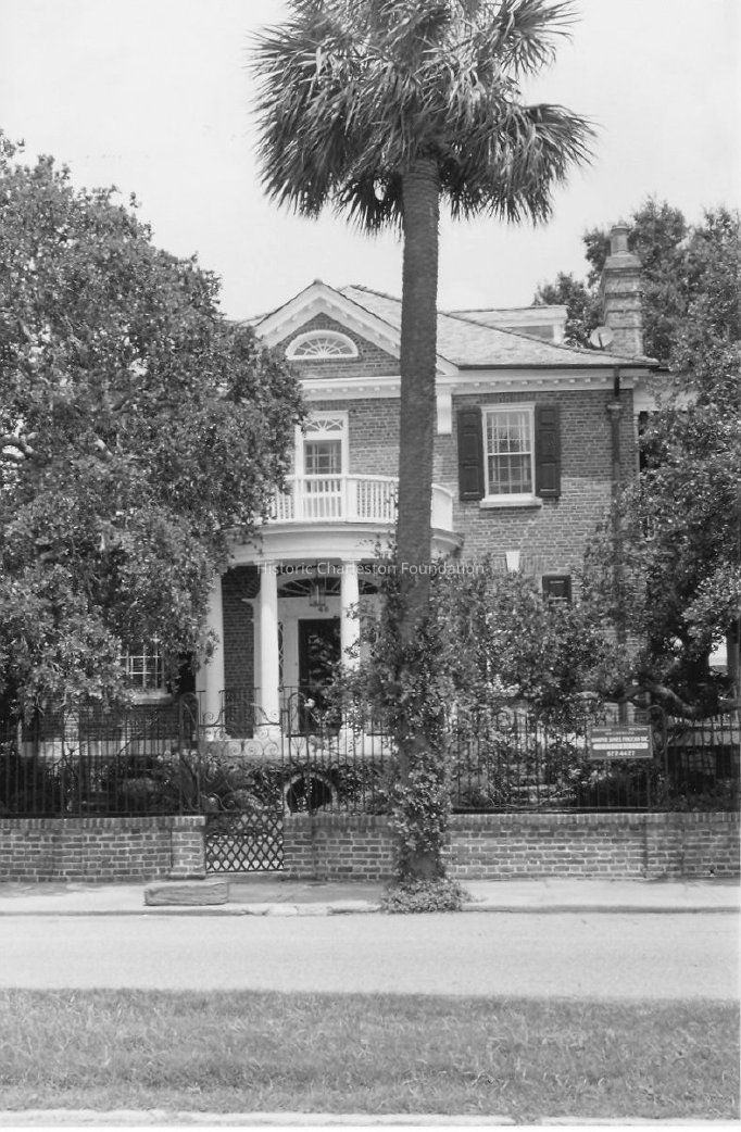 Constructed 1926-28. Simons and Lapham, architects. The newly formed partnership of Albert Simons and Samuel Lapham utilized their exceptional knowledge of Charleston Neoclassical detailing in the planning of this Revival style dwelling for Dr. and Mrs. Robert Barnwell Rhett. Standing on a large lot enclosed by a handsome brick coping with wrought-iron fence and gates topped with cast stone Neoclassical caps and spheres, the building is constructed of hand-molded brick laid in a variant of the Flemish bond pattern. A double curvilinear stair approaches a Neoclassical portico with fluted Tuscan columns, detailing that is repeated in a piazza on the east side of the building. A pediment supported by console brackets projects from the slate roof, echoing the other Federal houses in the city. (Poston, Buildings of Charleston.)