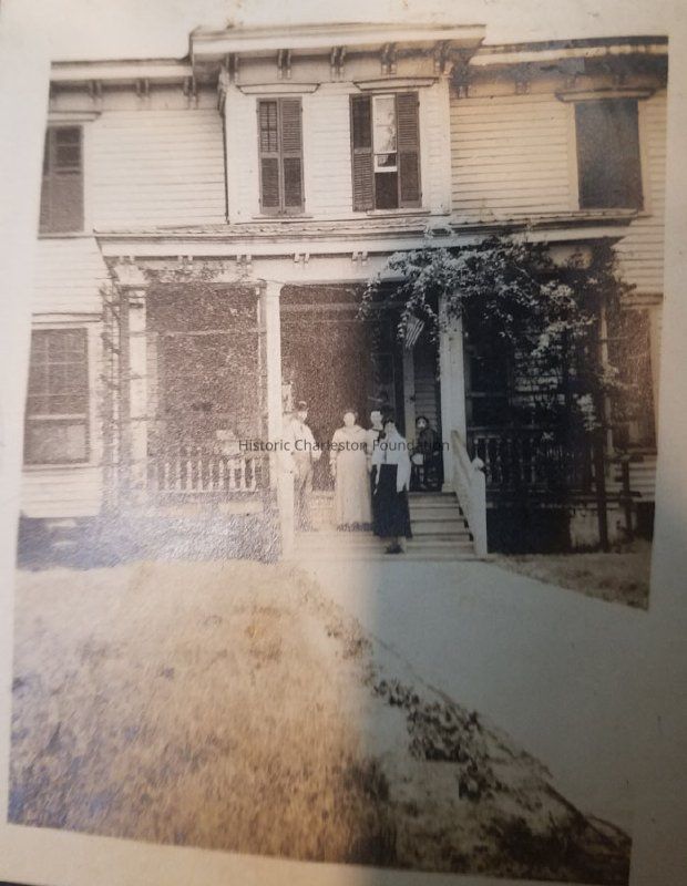Scan of an early-20th century photograph of 47 Alexander Street, the residence of Hans Bagger, showing the front of the house. Hans Bagger was the Vice Consul of Denmark. Three women and a man stand on the steps leading to the front porch. Another person whose face appears to be bandaged sits on the porch.Collection