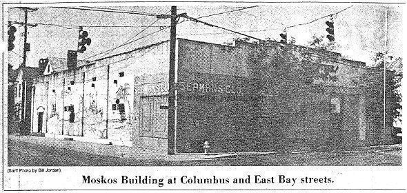 Located at the corner of Columbus and East Bay Streets, the Moskos Building opened in 1947 as a shopping center and later housed a nightclub. The shopping center included a supermarket, drug store, barber shop, and beauty salon. Later the building was used as a dry cleaners that operated there for more than 20 years before closing in the 1970s. Purchased by the City (date not indicated) to be redeveloped.