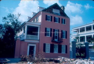 Color (Kodachrome) slide of 47 East Bay Street (Anne Boone House) after Hurricane Hugo.