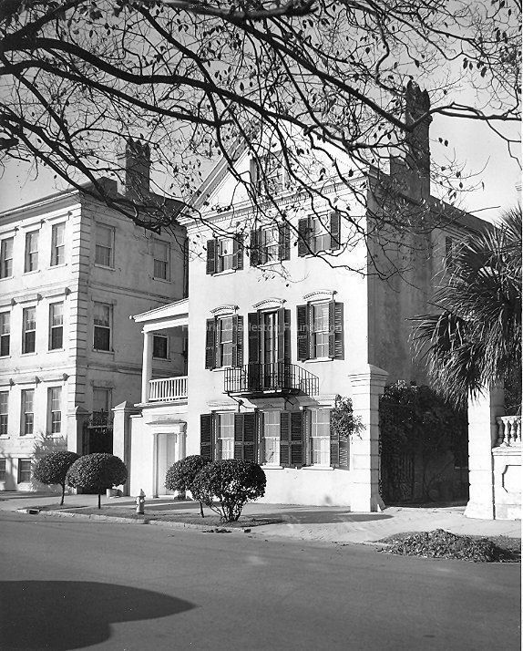 B&W photograph of the Anne Boone House (47 East Bay Street), showing the southeast corner of the house. Also shows the southeast corner of 45 East Bay Street at left.