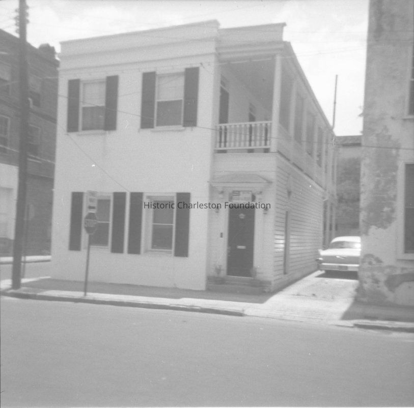 B&W photograph of 47 Hasell Street, corner view of house showing the north (front) and west (piazzas) elevations.